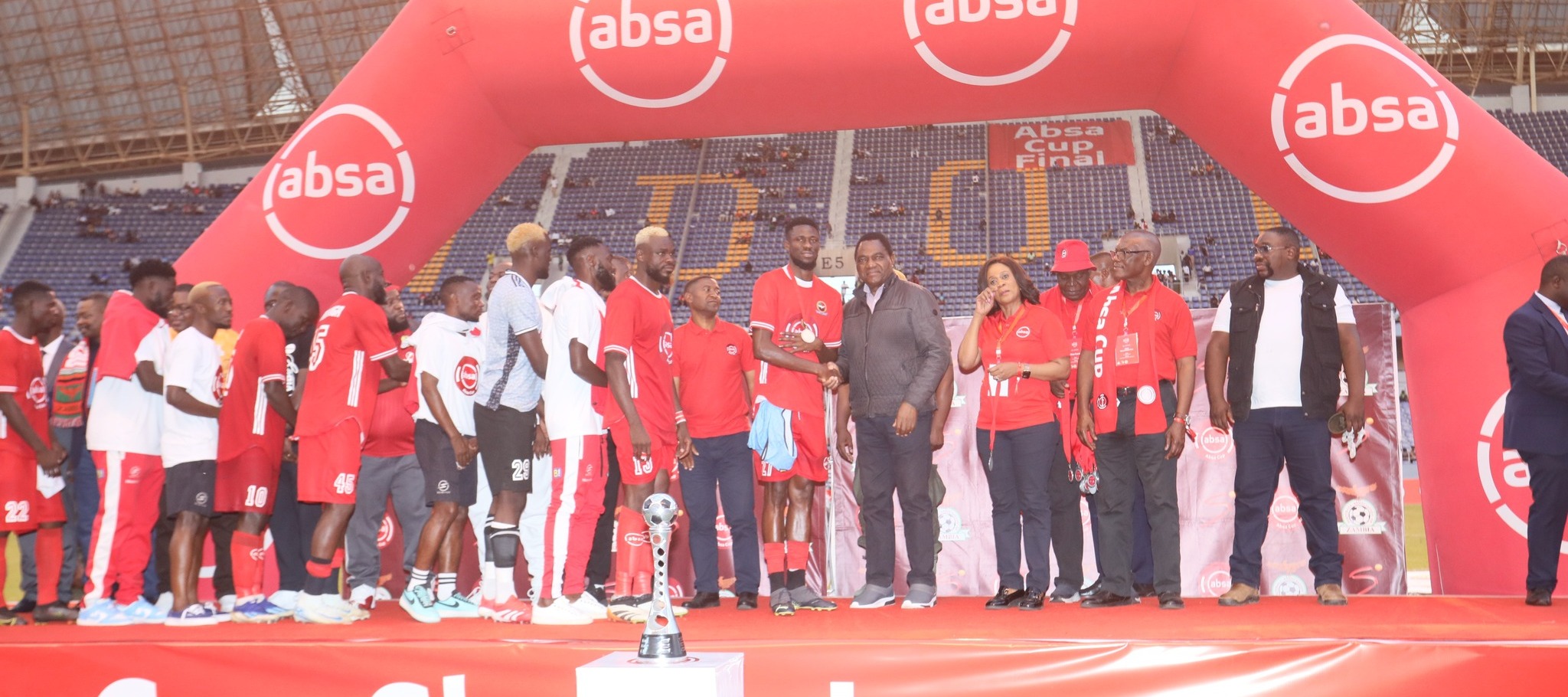 The 2025 ABSA Cup final was graced by several dignitaries including President Hichilema, Sports Minister Elvis Nkandu, FAZ President Keith Mweemba, and Absa Bank Zambia Managing Director Mizinga Melu.